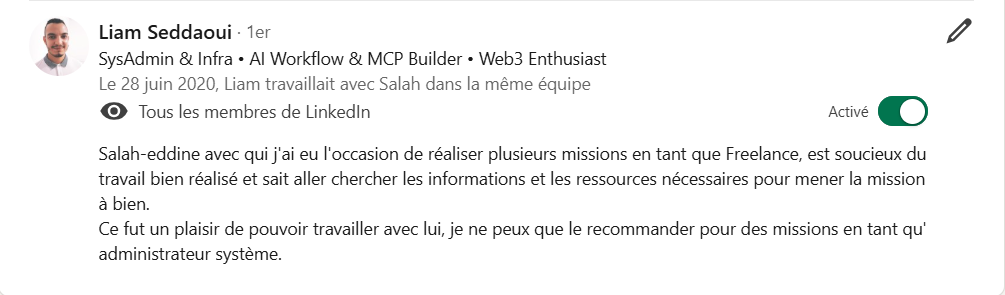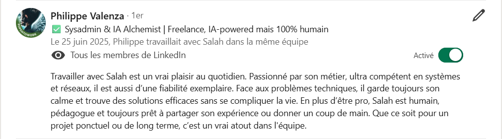 Je m'appelle Salah, je suis administrateur système freelance depuis 8 ans.